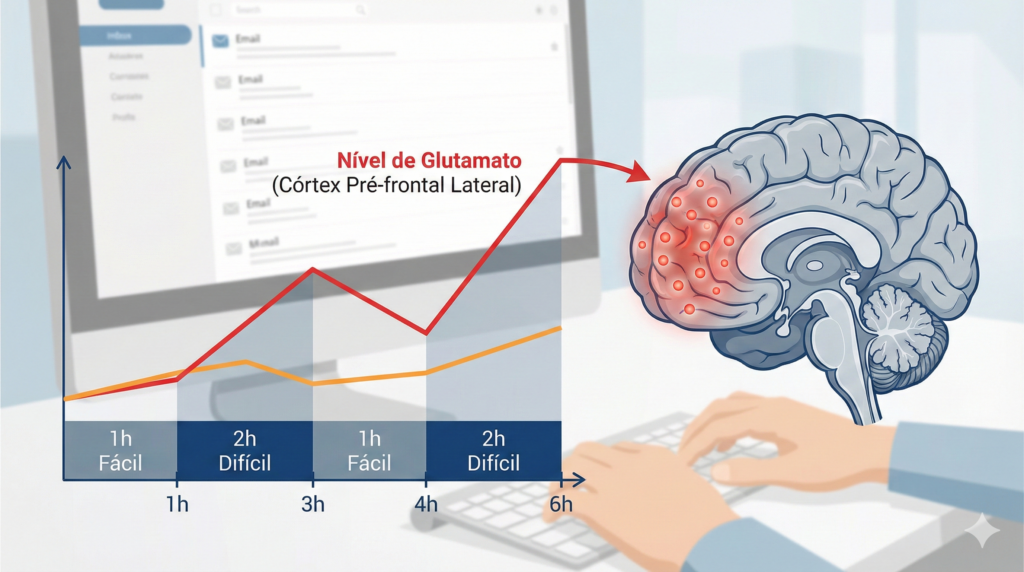Trabalho cognitivo intenso força o córtex pré-frontal a disparar repetidamente. Cada ativação solta glutamato — o aminoácido que neurônios usam para se comunicar.